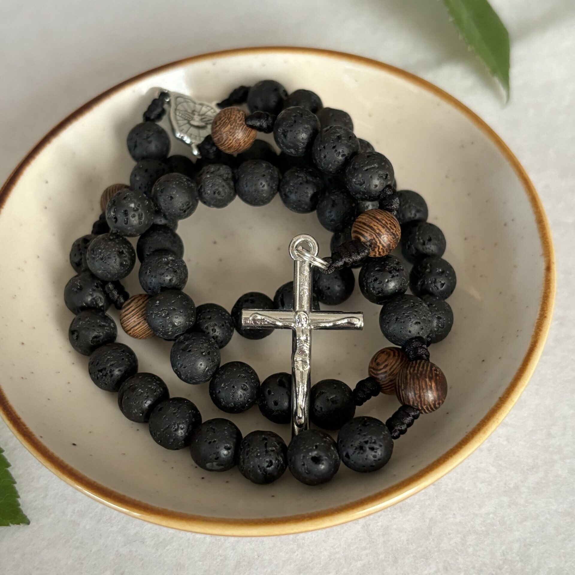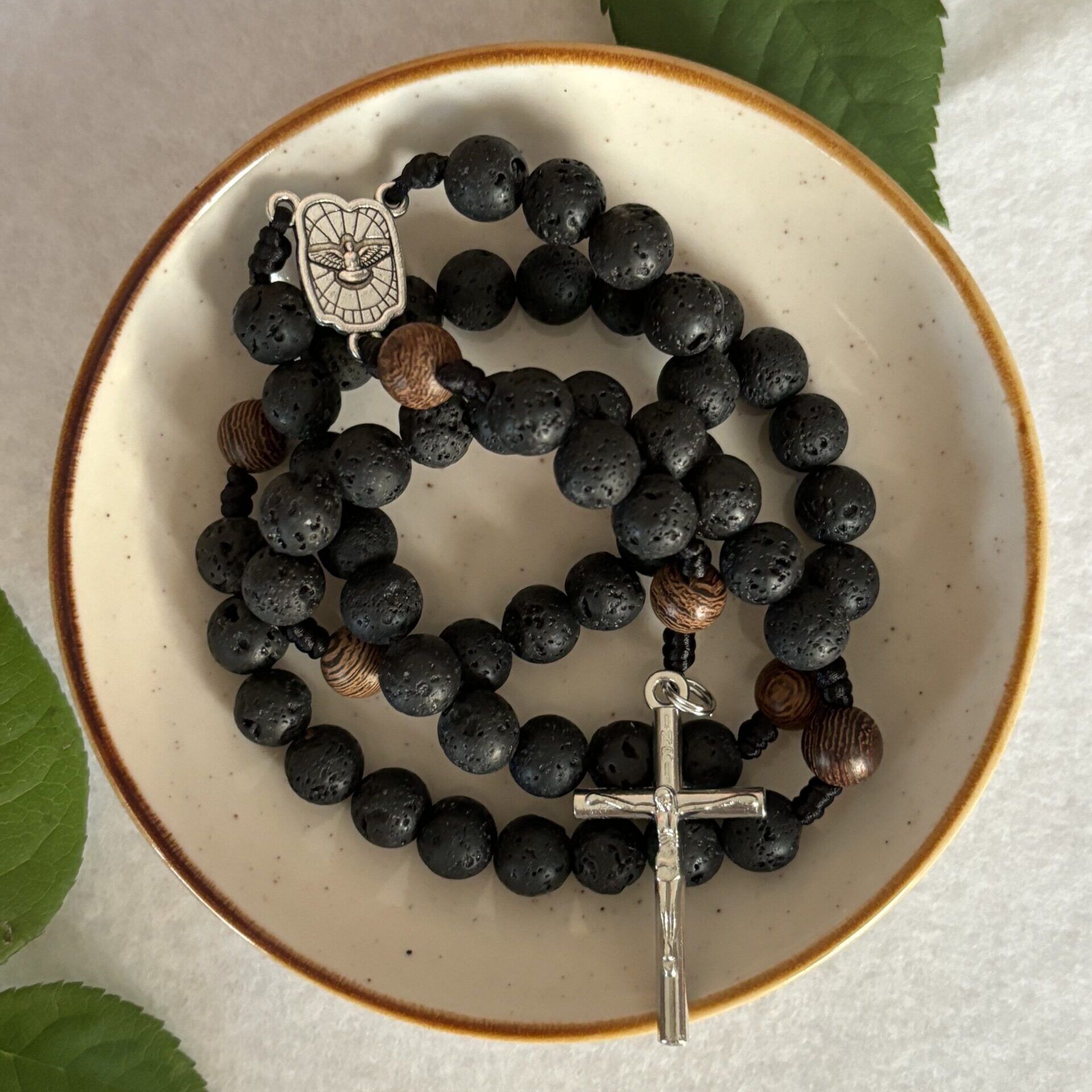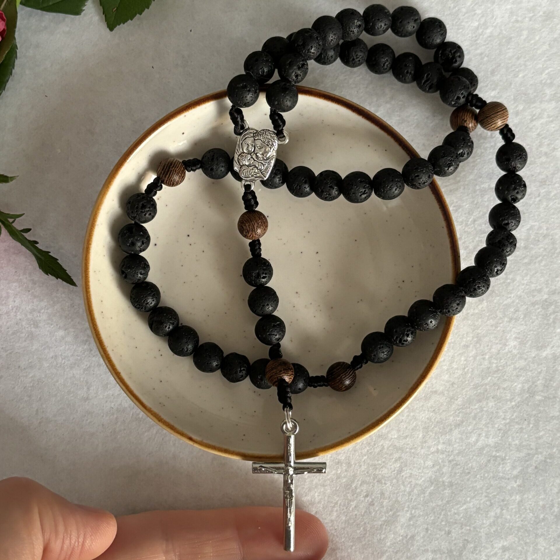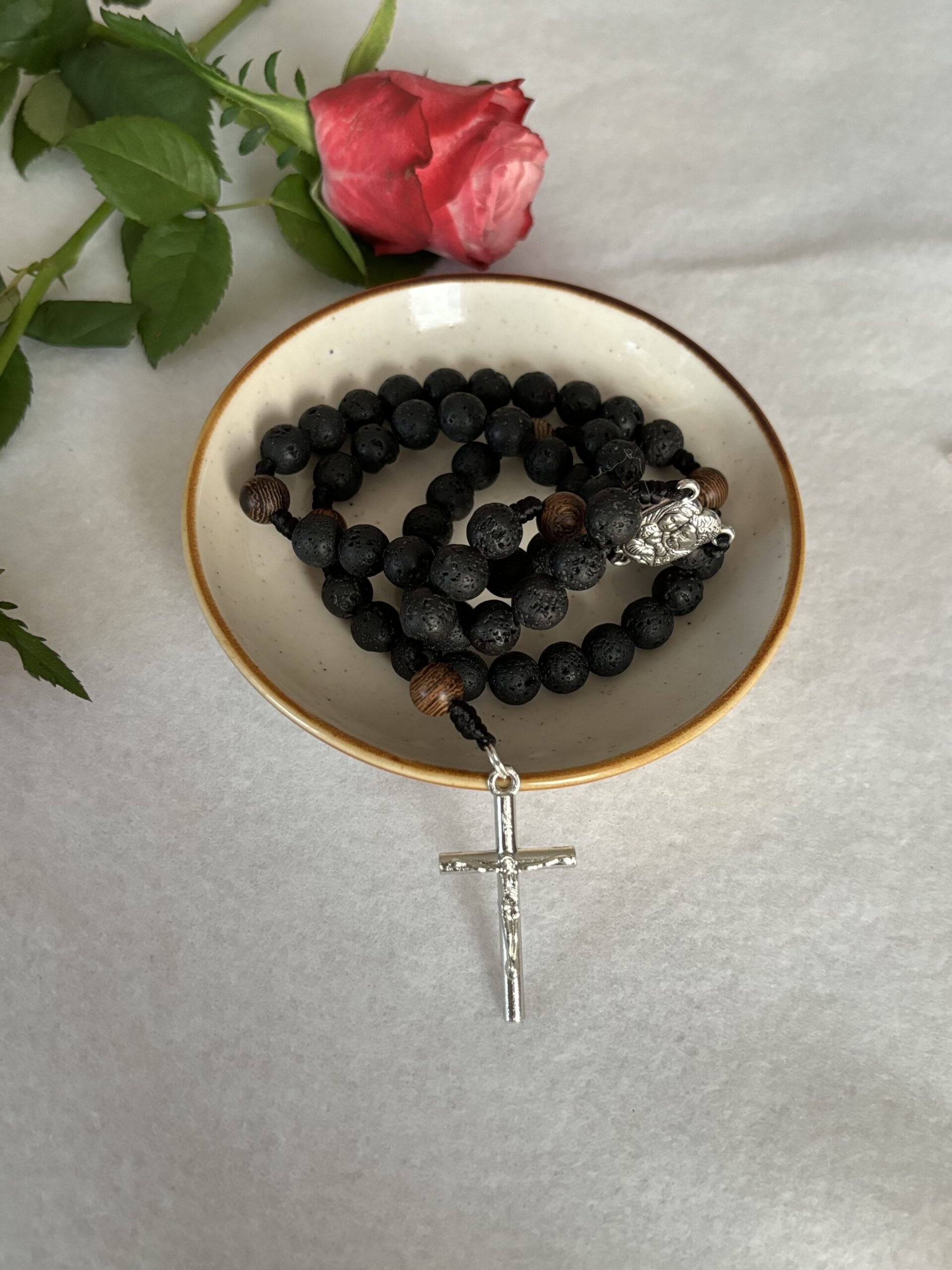 Daniel, ponieważ nie chce ugiąć się i oddać pokłonu posągom bożków trafia do jaskini pełnej lwów. Z myślą o tym surowym i zimnym miejscu do wykonania tego różańca wybrałam koraliki z lawy wulkanicznej. Dodając do nich drewniane kuleczki myślałam o tym jak gorliwie służący króla Dariusza dorzucali drewna do pieca w którym był Daniel i jego współtowarzysze a oni się nie spalali. Uratowała ich gorliwa modlitwa.