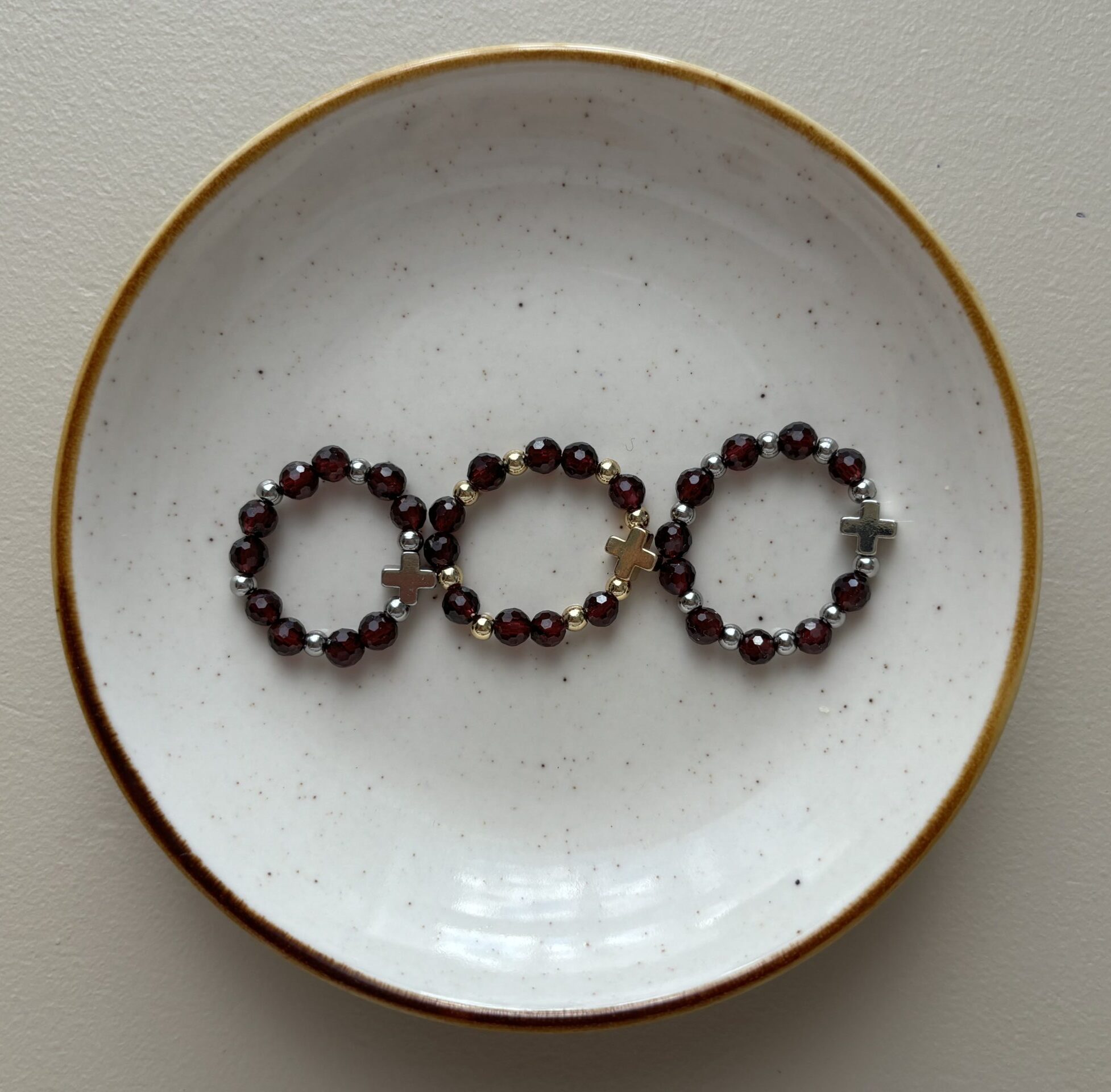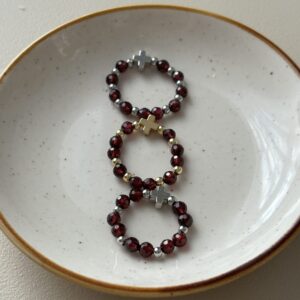 Każdy pierścionek nieco się rozciąga, ponieważ jest wykonany na gumce. Jednak dla wygody użytkowania wprowadzam trzy warianty, które odpowiadają następującym rozmiarom (mierzone na luźno, bez naciągania)