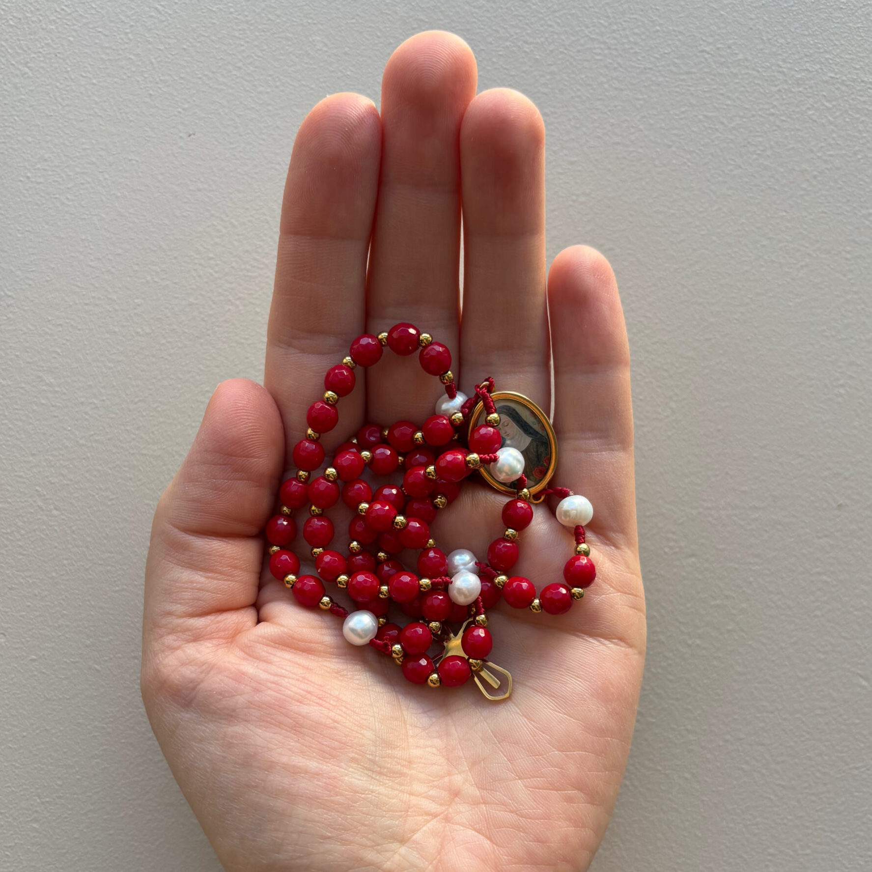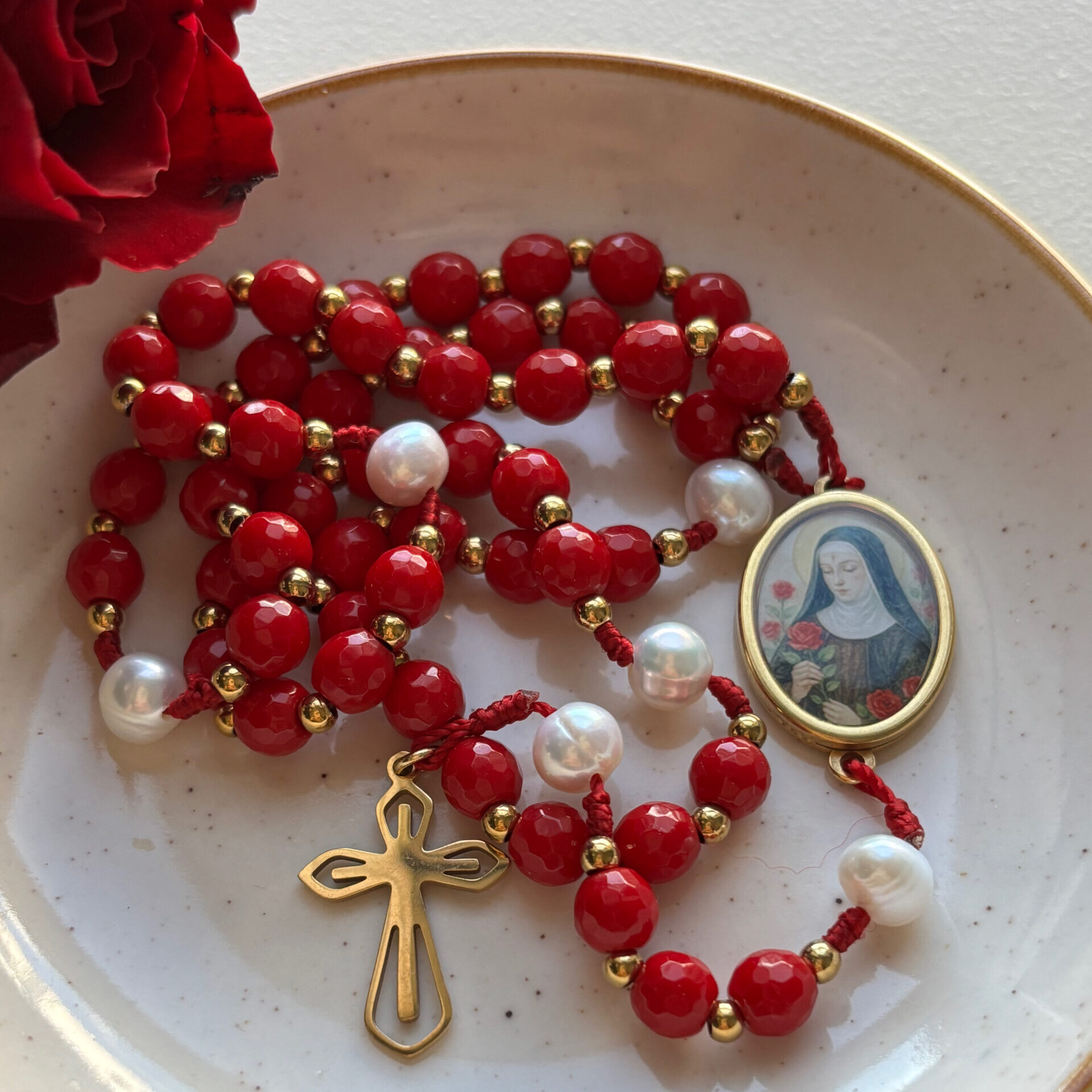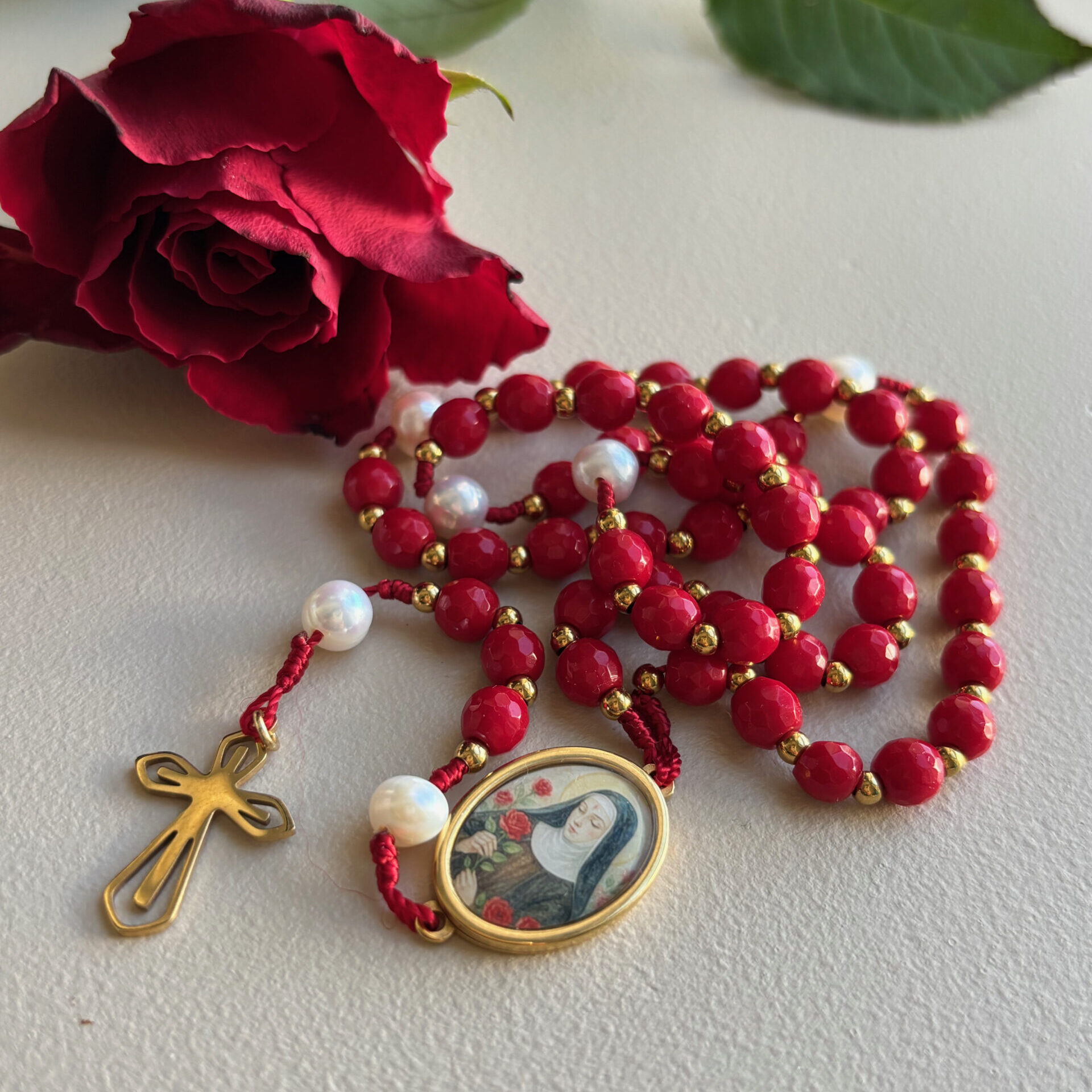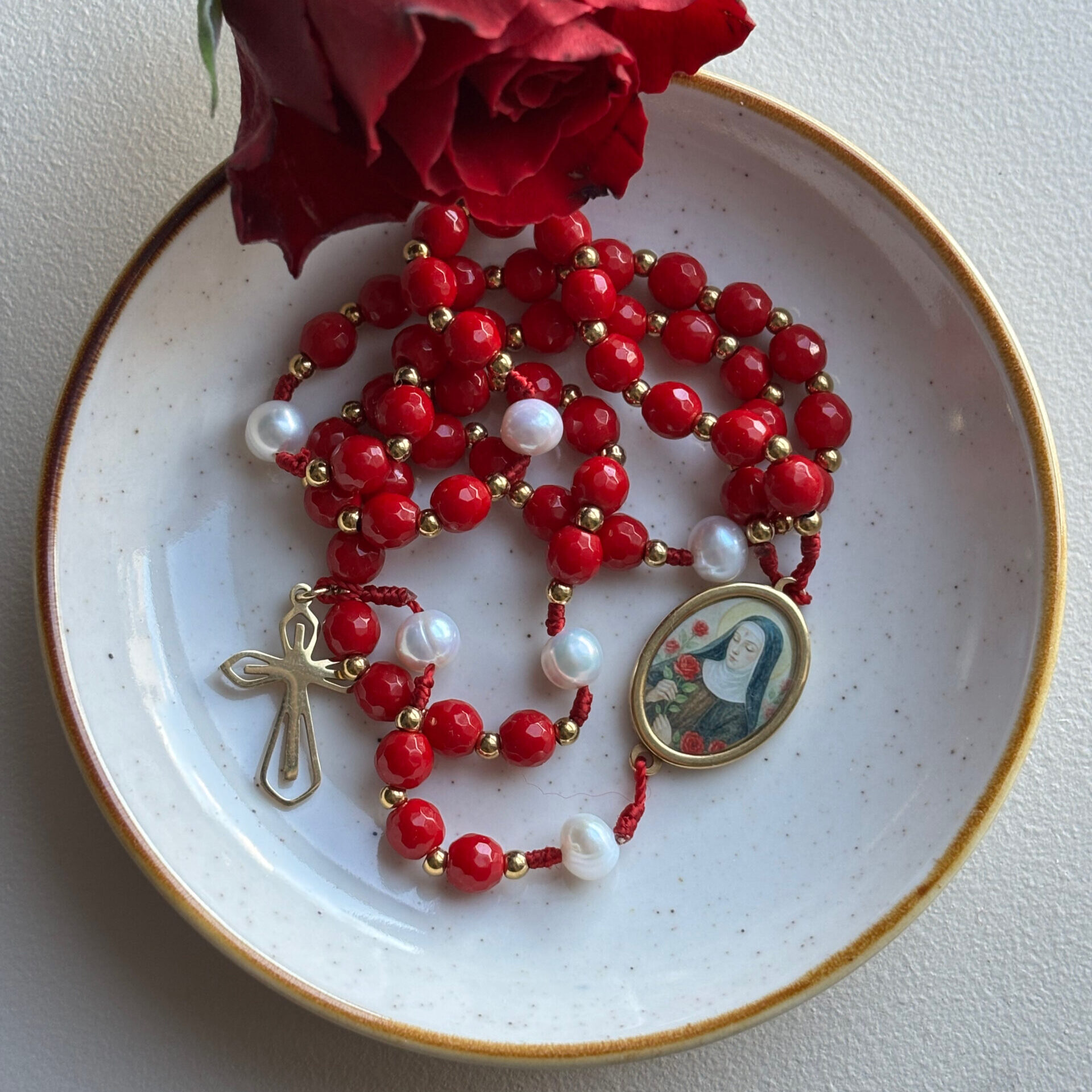 Czerwień nieodłącznie kojarzy mi się z różami św. Rity. W tym różańcu obok czerwonych koralików mamy także perły naturalne, ponieważ Papież Leon XIII nadał św. Ricie tytuł Perły Umbrii.