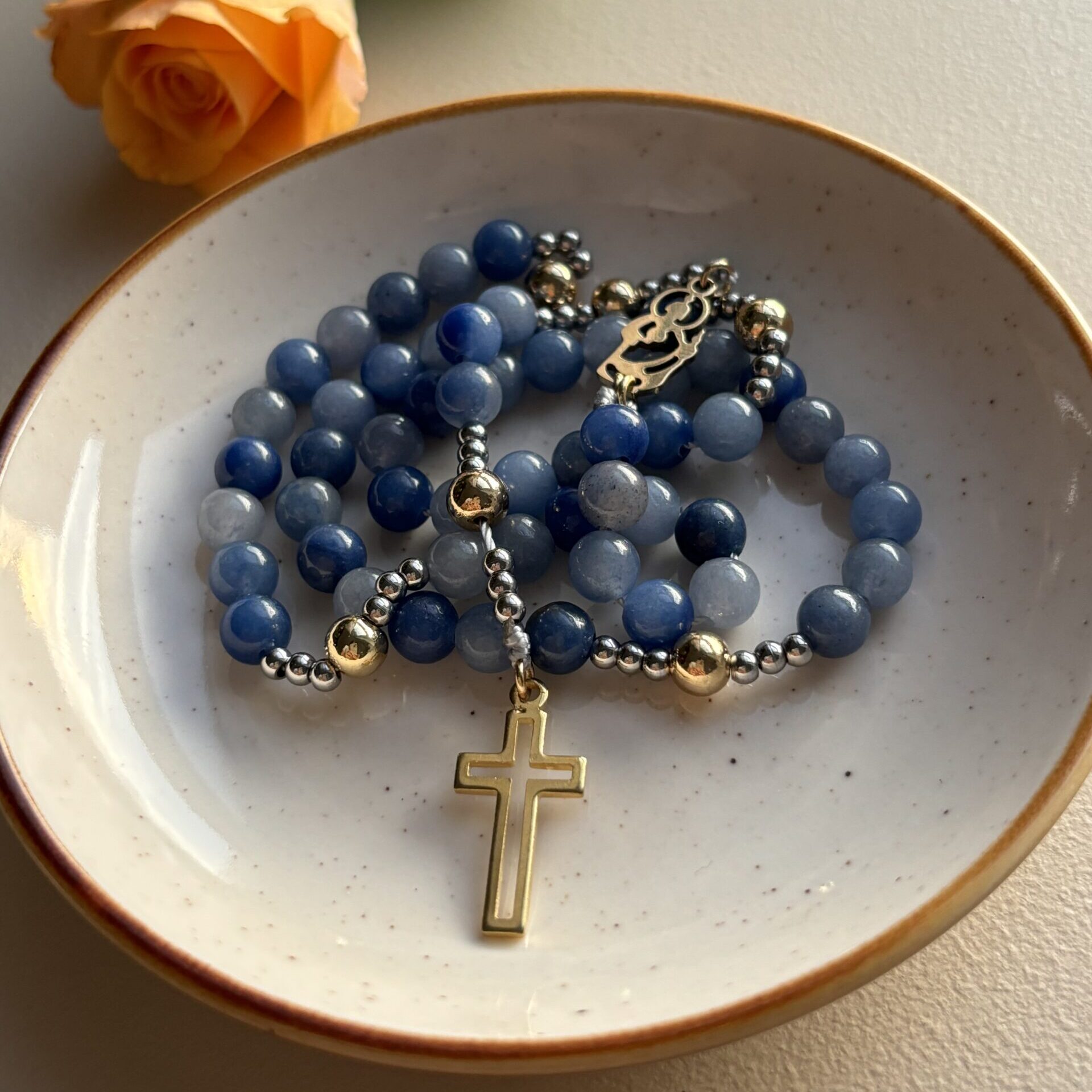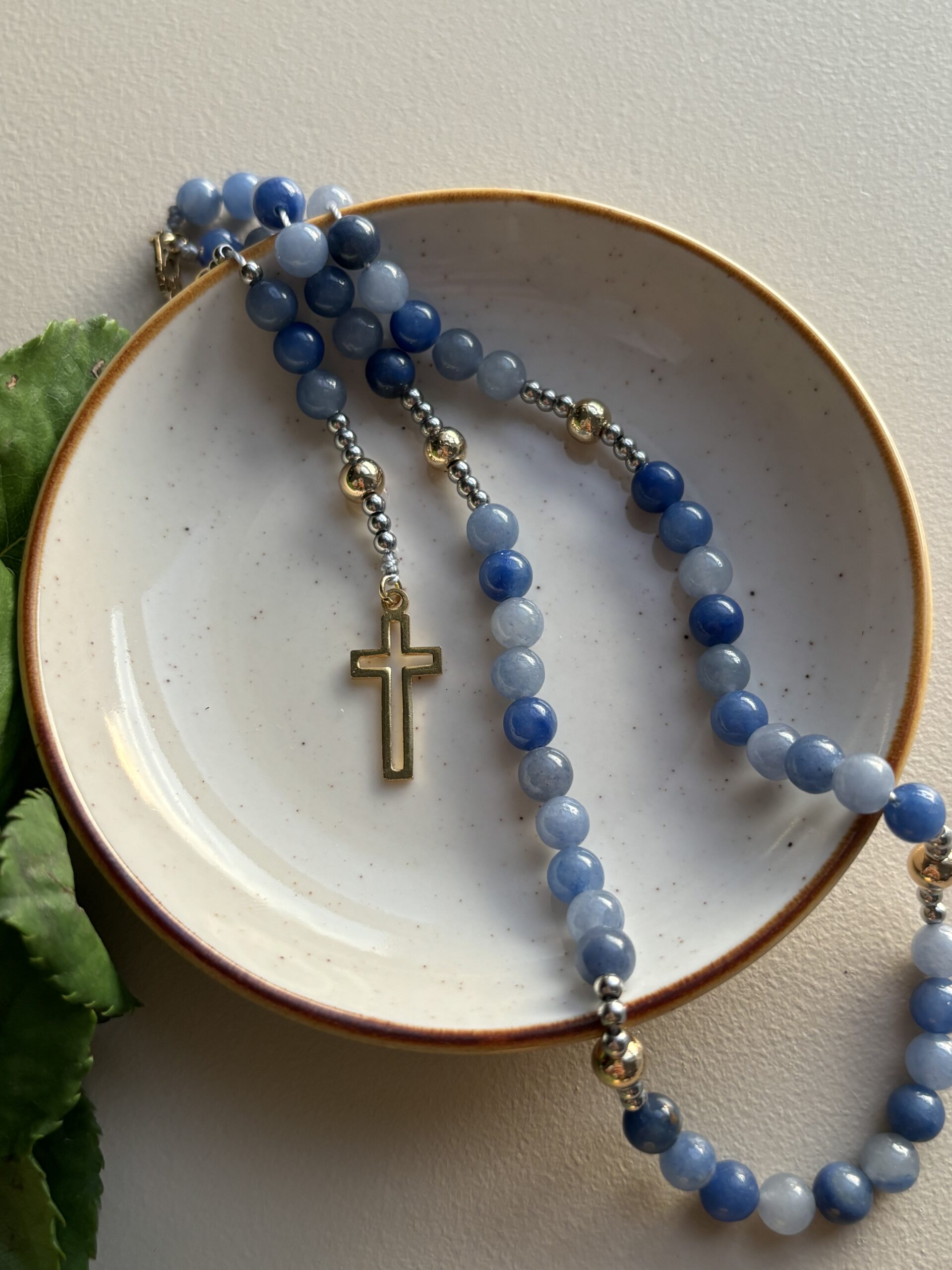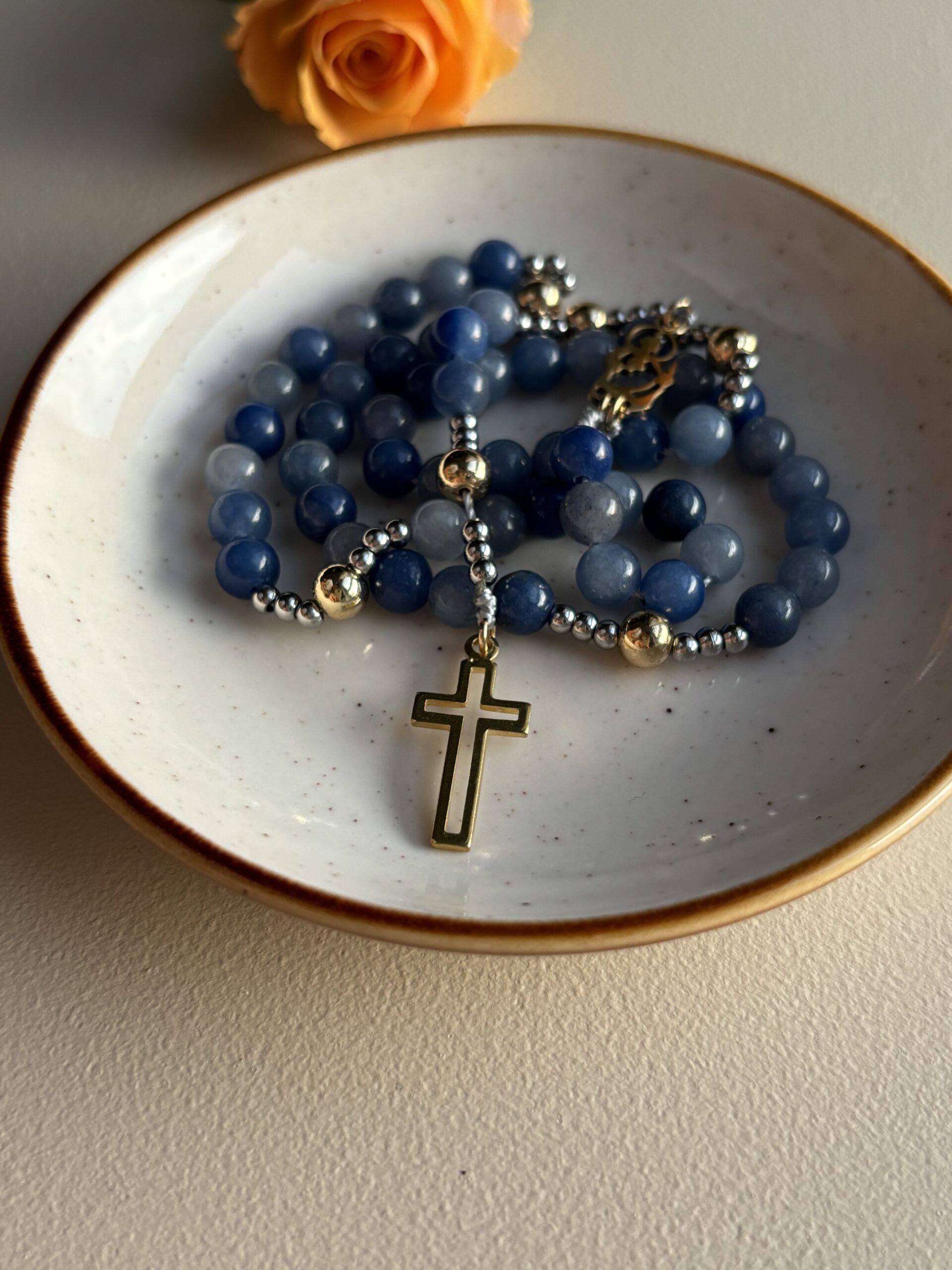 Krzyżyk użyty w tym różańcu i widoczny na zdjęciu już nie jest aktualny dla tego modelu. Przed zamówieniem różańca skontaktuj się ze mną a razem dobierzemy krzyżyk, który zamontuję w Twoim różańcu. 🙂