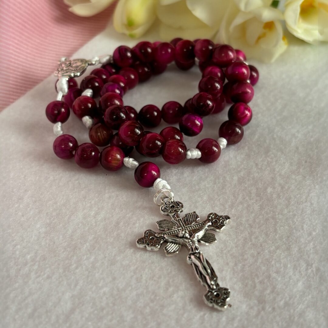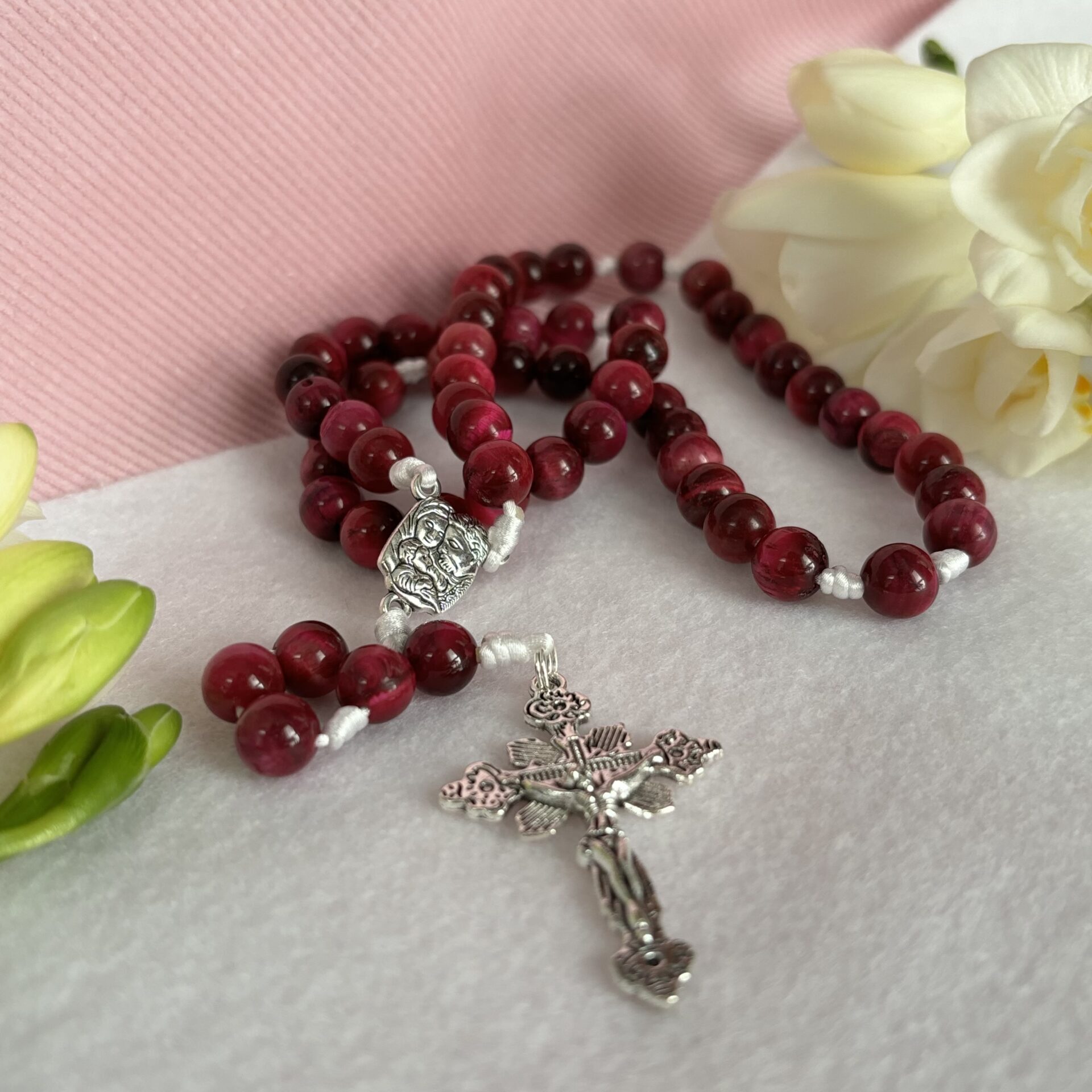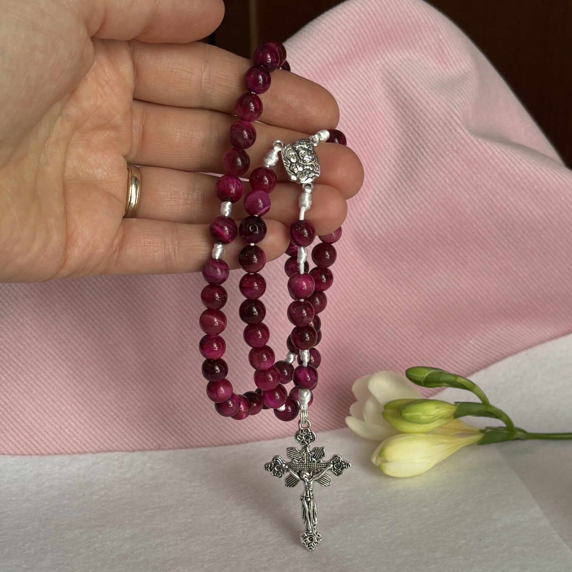 Różańce wykonuję ręcznie dbając o wszelkie detale. Każdy z nich jest jedyny i niepowtarzalny więc otrzymany produkt może różnić się od tego widocznego na zdjęciu np. z powodu nieco innej barwy czy deseni na koralikach. Jest to spowodowane tym, że różaniec jest wykonany z kamieni naturalnych.