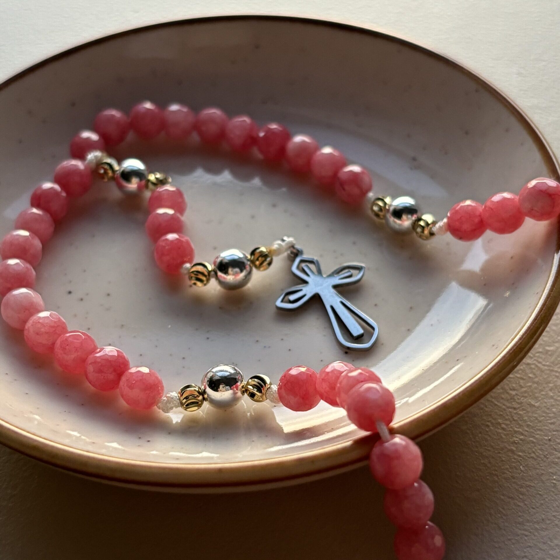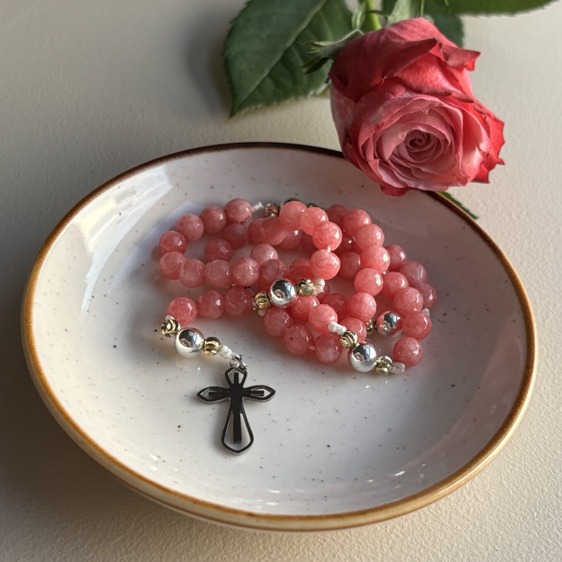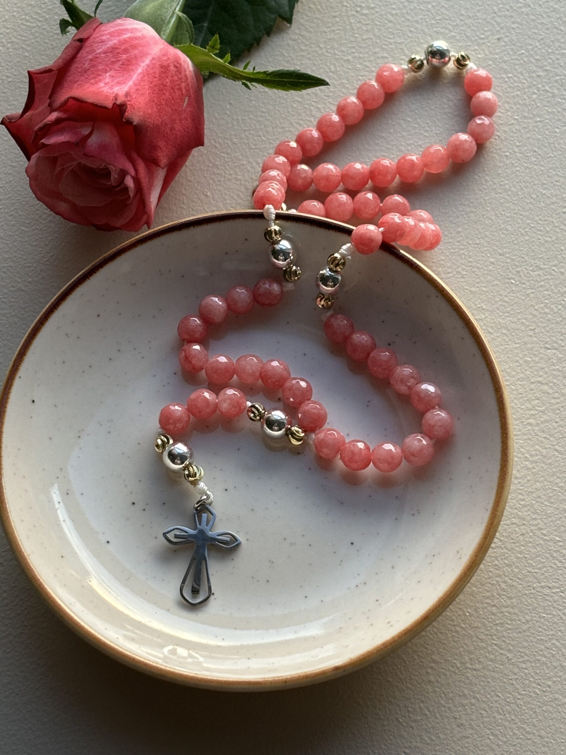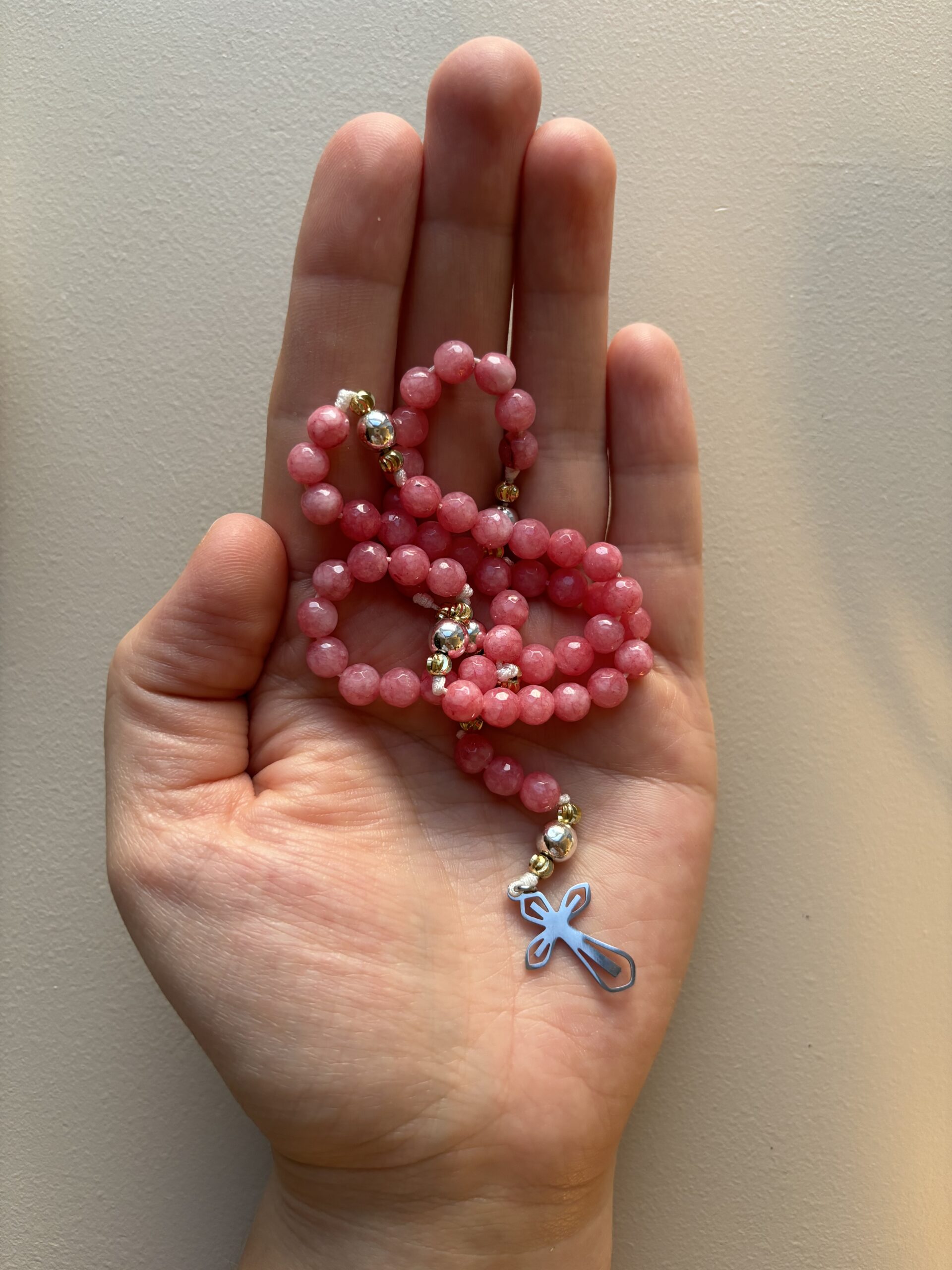 Różańce wykonuję ręcznie dbając o wszelkie detale. Każdy z nich jest jedyny i niepowtarzalny więc otrzymany produkt może różnić się od tego widocznego na zdjęciu np. z powodu nieco innej barwy czy deseni na koralikach. Jest to spowodowane tym, że różaniec jest wykonany z kamieni naturalnych.