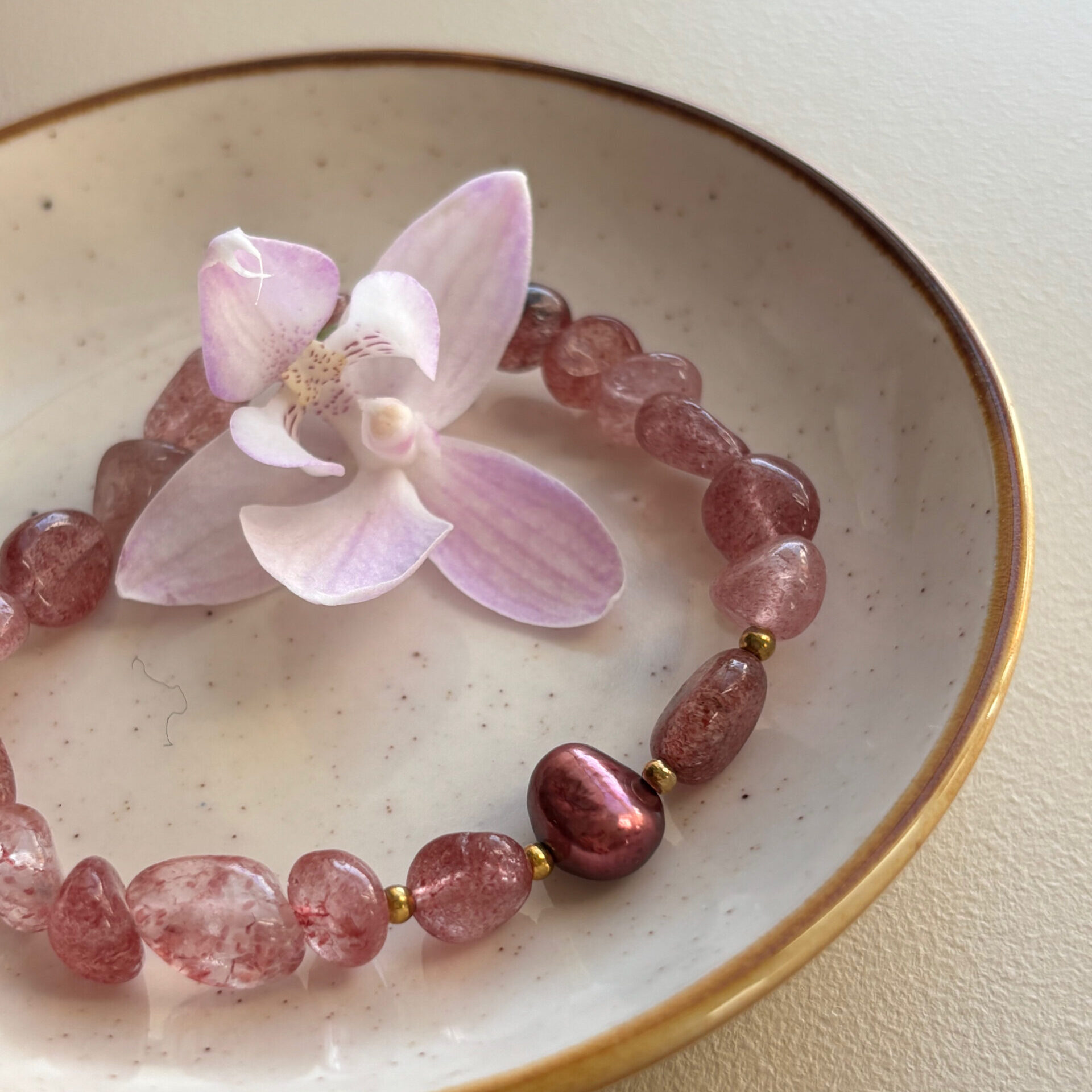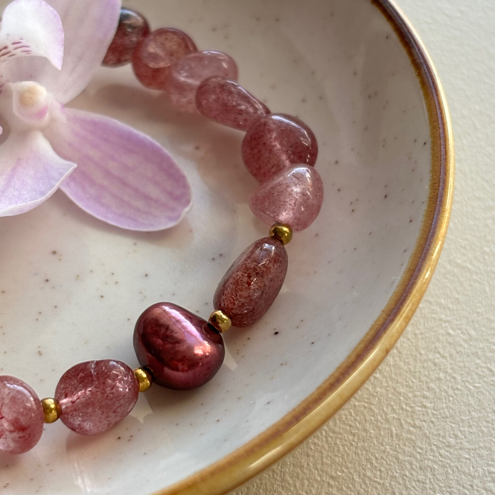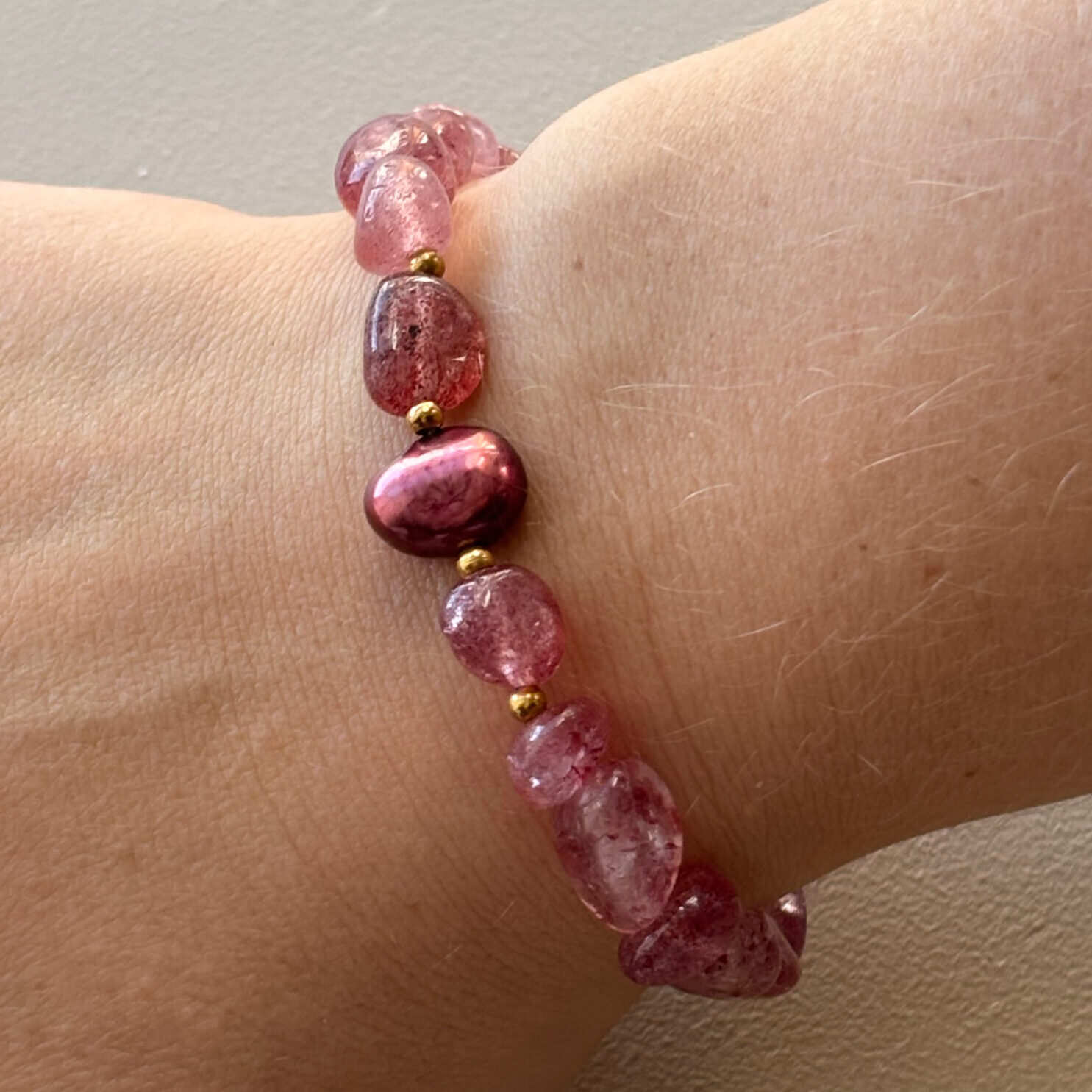 • kamienie: kwarc truskawkowy 6-8 mm, perła KESHI (perła naturalna, słodkowodna) – bordowa