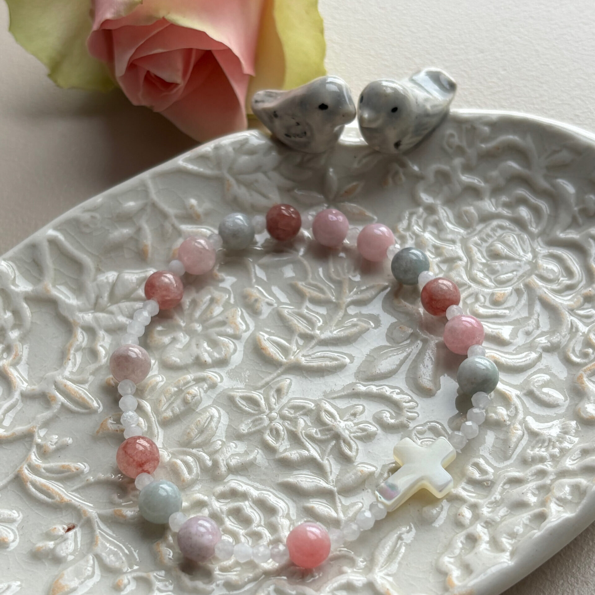 Różaniec wykonuję ręcznie dbając o wszelkie detale. Każdy z nich jest jedyny i niepowtarzalny więc otrzymany produkt może różnić się nieco od tego widocznego na zdjęciu. Dodatkowo koraliki mogą nieco różnić się barwą.