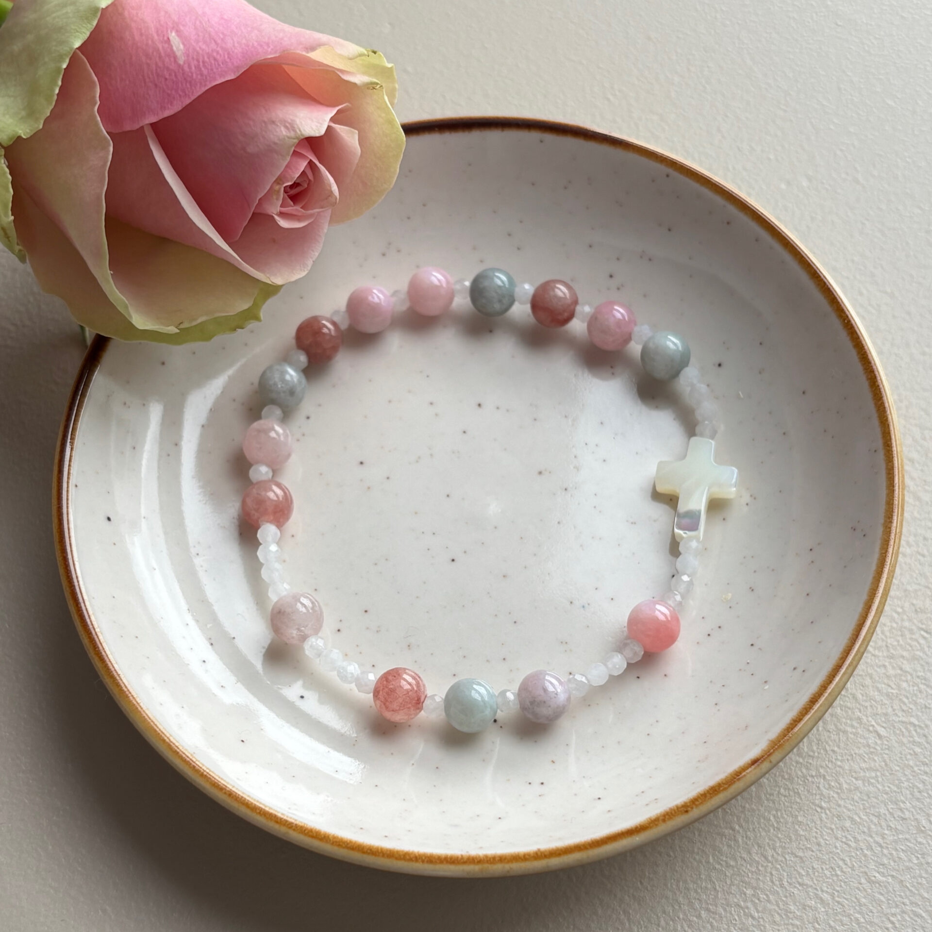 - koraliki przekładkowe – kryształ górski ok 3 mm (ich ilością reguluję obwód)